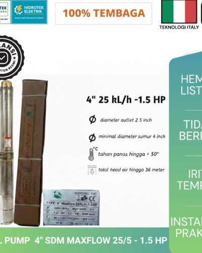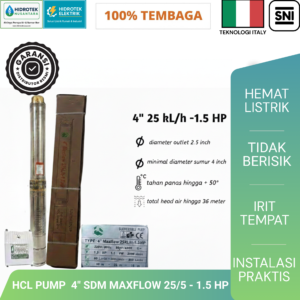 Pompa Air Submersible HCL Pump 4″ 1.5 HP SDM MAXFLOW 25/5 adalah solusi terbaik untuk kebutuhan air sumur dalam. Dengan tenaga optimal, debit besar, dan desain efisien, pompa ini mampu memberikan suplai air yang stabil dan tahan lama.