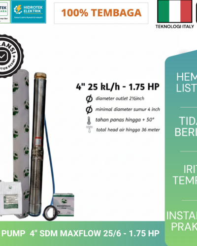 Pompa Air Submersible HCL Pump 4″ 1.75 HP adalah solusi tepat bagi pengguna yang membutuhkan sistem pemompaan air yang andal, efisien, dan tahan lama. Produk ini dirancang khusus untuk aplikasi sumur bor dengan diameter standar 4 inch. Karena itu, pompa ini sangat cocok digunakan untuk kebutuhan rumah tangga, pertanian, maupun usaha skala menengah.
