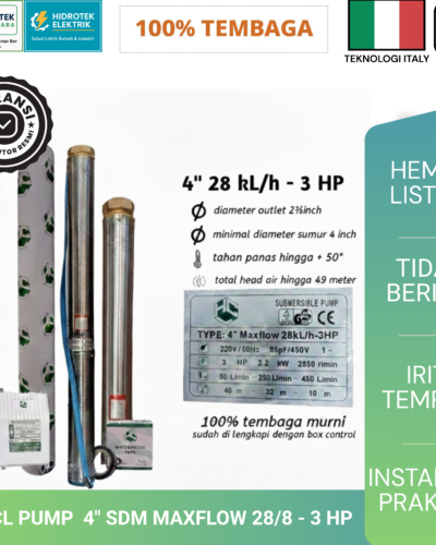 Pompa Air Submersible HCL Pump 4″ SDM MAXFLOW 25/10 3 HP Merupakan pilihan tepat bagi Anda yang membutuhkan suplai air bersih dengan debit besar dan tekanan stabil dari sumur dalam. Produk ini dirancang untuk bekerja secara optimal pada kedalaman tertentu dengan performa yang konsisten, sehingga sangat cocok digunakan untuk rumah tinggal besar, perumahan, pertanian, hingga… selengkapnya