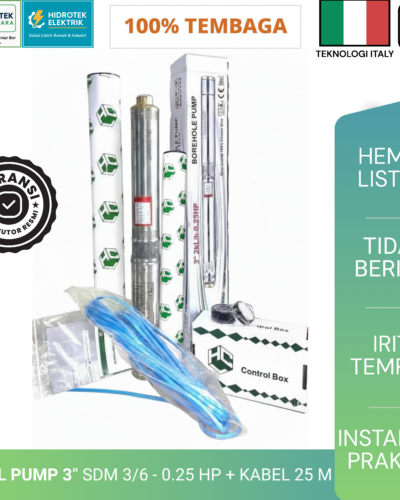 Efisiensi daya menjadi salah satu keunggulan utama produk ini. Desain ringkas memudahkan pemasangan pada berbagai kondisi sumur bor. Tambahan kabel 25 meter memberikan kemudahan instalasi sekaligus menghemat biaya.